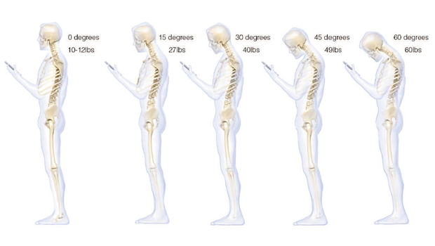 A recent study in the journal Surgical Technology International quantified the problem: As the head tilts forward 15 degrees from neutral, the forces on the cervical spine and supporting musculature increase to 27 pounds. As the tilt increases, the forces increase to 40 pounds at 30 degrees, 49 pounds at 45 degrees and 60 pounds at 60 degrees.